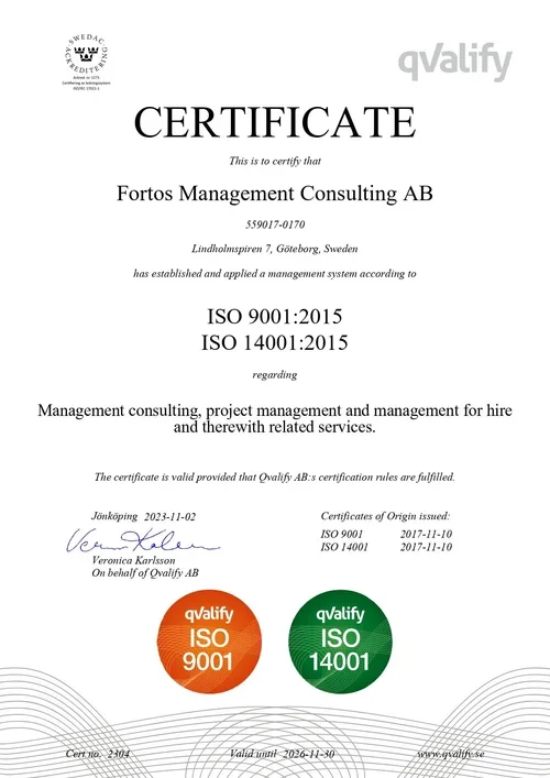Working with Fortos means that you work with a company compliant with renowned quality standards like ISO9001 and ISO14001.